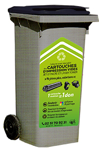 Collecte de vos cartouches d'encre vides d'imprimantes et copieurs afin de favoriser leur réemploi. Cartouches jet d'encre et toner. Collecte éco-solidaire ! |